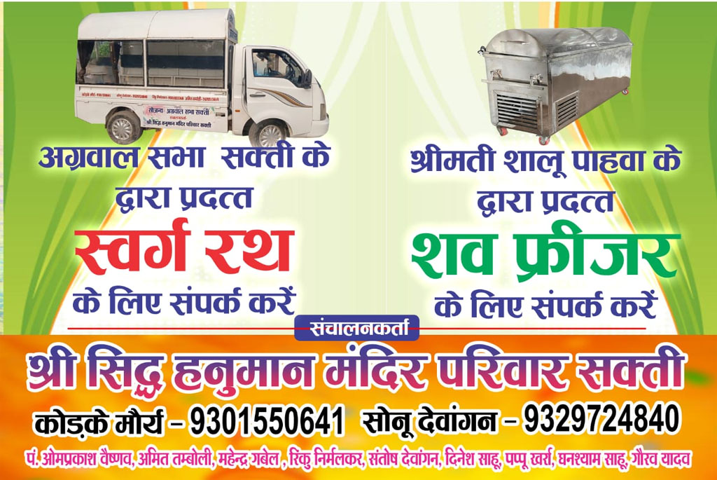 अग्रवाल सभा सक्ती के द्वारा संचालित स्वर्ग रथ वाहन, शालू पाहवा द्वारा प्रदत्त शव फ्रीजर की सुविधा मुफ्त में लोगों को उपलब्ध कराई जाती है। ऐसे में श्री सिद्ध हनुमान मंदिर परिवार शक्ति समिति द्वारा किए जा रहे जनहितैषी कार्यों की नगर में जमकर प्रशंसा की जा रही है।