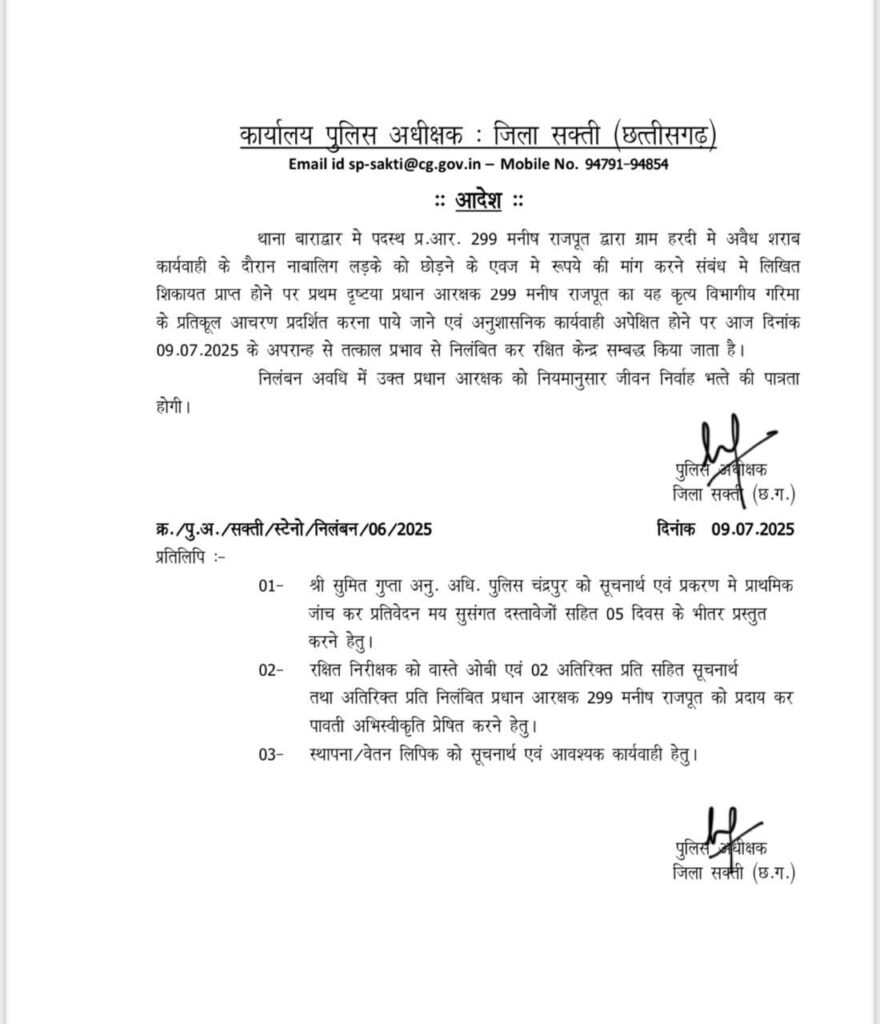 рдерд╛рдирд╛ рдмрд╛рд░рд╛рджреНрд╡рд╛рд░ рдореЗрдВ рдкрджрд╕реНрде рдкреНрд░рдзрд╛рди рдЖрд░рдХреНрд╖рдХ рдордиреАрд╖ рд░рд╛рдЬрдкреВрдд рдкрд░ рдЧреНрд░рд╛рдо рд╣рд░рджреА рдореЗрдВ рдЕрд╡реИрдз рд╢рд░рд╛рдм рдХрд╛рд░реНрдпрд╡рд╛рд╣реА рдХреЗ рджреМрд░рд╛рди рдирд╛рдмрд╛рд▓рд┐рдЧ рд▓рдбрд╝рдХреЗ рдХреЛ рдЫреЛрдбрд╝рдиреЗ рдХреЗ рдмрджрд▓реЗ рдкреИрд╕реЗ рдХреА рдорд╛рдВрдЧ рдХрд░рдиреЗ рдХрд╛ рдЖрд░реЛрдк рд╣реИред рдЗрд╕ рдЧрдВрднреАрд░ рдорд╛рдорд▓реЗ рдХреА рд▓рд┐рдЦрд┐рдд рд╢рд┐рдХрд╛рдпрдд рдорд┐рд▓рддреЗ рд╣реА SP рдЕрдВрдХрд┐рддрд╛ рд╢рд░реНрдорд╛ рдиреЗ рддрддреНрдХрд╛рд▓ рдкреНрд░рднрд╛рд╡ рд╕реЗ рдЖрд░рдХреНрд╖рдХ рдХреЛ рдирд┐рд▓рдВрдмрд┐рдд рдХрд░ рджрд┐рдпрд╛ред