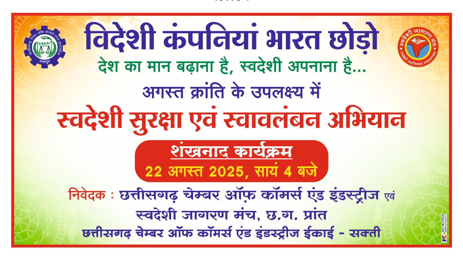 सक्ती। देश में स्वदेशी को बढ़ावा देने और विदेशी कंपनियों के बहिष्कार को लेकर छत्तीसगढ़ में बड़ा जनजागरण अभियान शुरू हो रहा है। इसी क्रम में छत्तीसगढ़ चैंबर ऑफ कॉमर्स एंड इंडस्ट्रीज की सभी इकाइयों में “स्वदेशी सुरक्षा एवं स्वावलंबन अभियान” के अंतर्गत 22 अगस्त 2025 को “विदेशी कंपनियां भारत छोड़ो शंखनाद कार्यक्रम” आयोजित किया जाएगा।