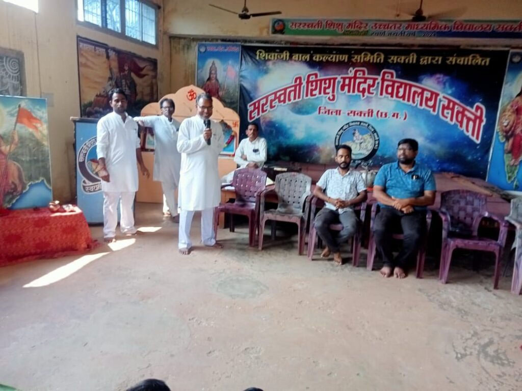 सकती. शक्ति शहर के सरस्वती शिशु मंदिर उच्चतर माध्यमिक विद्यालय में विगत ग्यारह शनिवारो से निरंतर भारत माता की आरती का भव्य किया जा रहा है,इसी श्रृंखला में 19 अक्टूबर को शनिवार के दिन आरती का कार्यक्रम आयोजित किया गया, इस कार्यक्रम के मुख्य अतिथि विद्यालय के पूर्व छात्र टंकेश्वर देवांगन एवं शक्ति के खेतान सेल्स एंड सर्विस के संचालक आशीष खेतान प्रमुख रूप से मौजूद थे, इस दौरान कार्यक्रम में जहां भारत माता के तेल चित्र पर तिलक लगाकर एवं दीप प्रज्वलन कर आरती की गई तो वही इस कार्यक्रम में विद्यालय परिवार के सदस्य एवं विद्यार्थी मौजूद रहे.