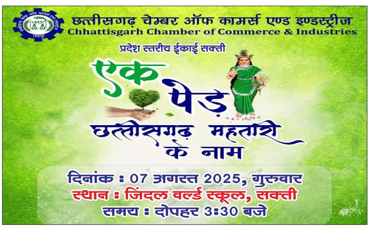 छत्तीसगढ़ चेम्बर ऑफ कॉमर्स एण्ड इंडस्ट्रीज, इकाई सक्ती द्वारा “एक पेड़ छत्तीसगढ़ महतारी के नाम” कार्यक्रम का आयोजन दिनांक 07 अगस्त 2025, गुरुवार को जिंदल वर्ल्ड स्कूल, सक्ती परिसर में दोपहर 3:30 बजे से किया जा रहा है।
