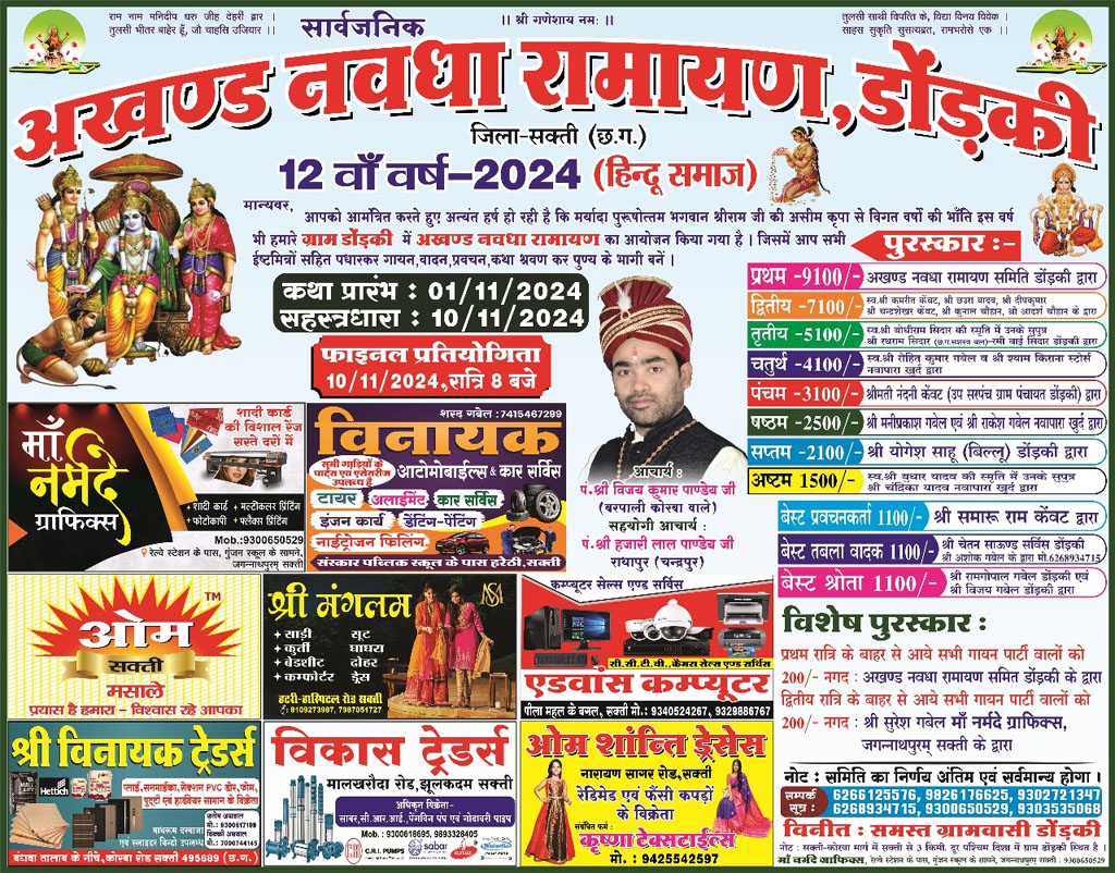 ग्राम डोडकी में आयोजित अखण्ड नवधा रामायण में आसपास के मानस प्रेमियों के अलावा अन्य जिले कोरबा, जाजगीर चांपा रायगड बिलासपुर से भी श्रद्धालु भक्तिभाव के साथ शामिल हो रहे हैं। डोडकी निवासी शिक्षक जगदीश प्रसाद गबेल ने बताया कि 1 नवम्बर से कथा आरंभ हुई है और 10 नवम्बर को सहस्त्रधारा और रामायण मानस गायन प्रतियोगिता का फाइनल कार्यक्रम रात्रि 8 बजे से आयोजित किया गया है। चयनित मानस प्रेमी को प्रथम पुरस्कार 9100 रूपये, द्वितीय पुरस्कार 7100 रूपये और तृतीय पुरस्कार के रूप में 5100 रूपये की नगद राशि प्रदान की जाएगी। इसी प्रकार से अष्टम पुरस्कार तक की घोषणा की गई है। इसी तरह सर्वश्रेष्ठ प्रवचनकर्ता, तबलावादक और बेस्ट श्रोता को पुरस्कार स्वरूप 1100 रूपये नगद राशि प्रदान की जाएगी।