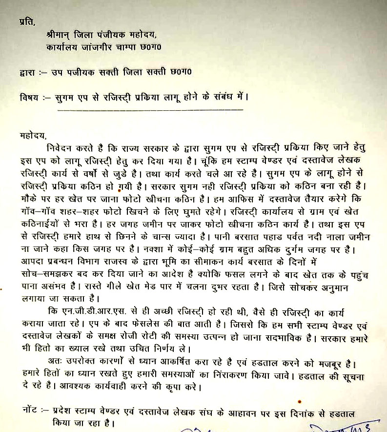 सक्ती। राज्य सरकार द्वारा रजिस्ट्री का काम सुगम एप से कराये जाने के विरोध में जिले के स्टाम्प वेंडर और दस्तावेज लेखकों ने अनिश्चित कालीन हड़ताल शुरू कर दी है। स्टाम्प वेंडर का मानना है कि इस एप से रजिस्ट्री करने का काम अब और कठिन हो गया है।