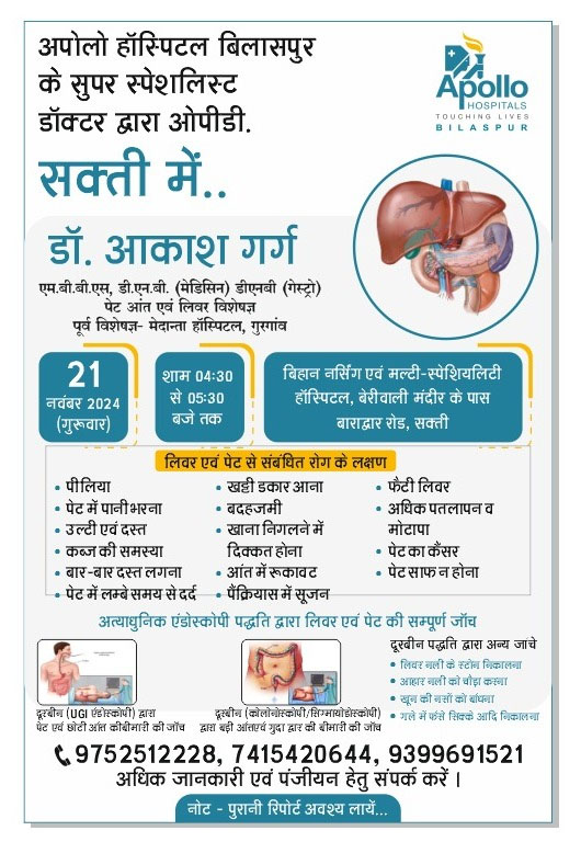 अपोलो हॉस्पिटल बिलासपुर के सुपर स्पेशलिस्ट चिकित्सक डॉ. आकाश गर्ग की सक्ती में ओपीडी 21 नवंबर को