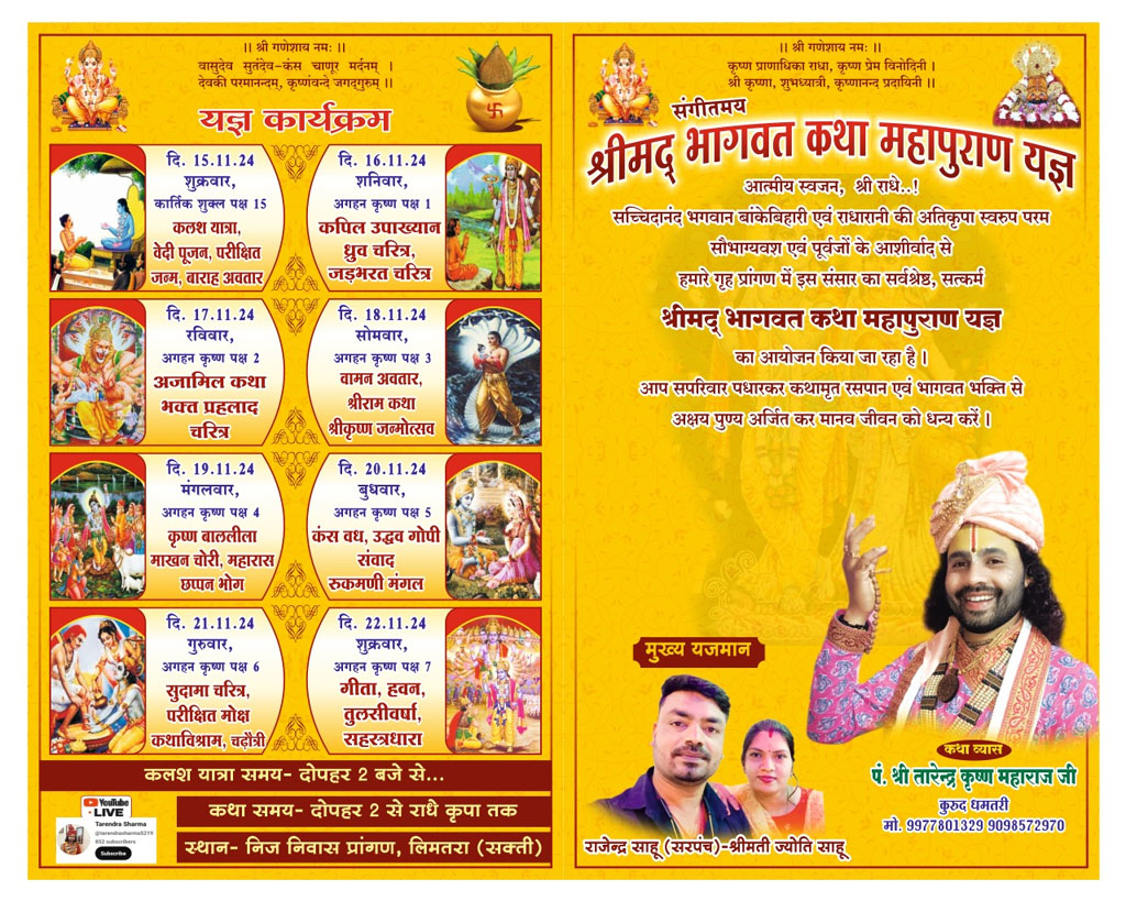 लिमतरा सरपंच के निवास में श्रीमद्भागवत कथा महापुराण यज्ञ का आयोजन 15 नवम्बर से