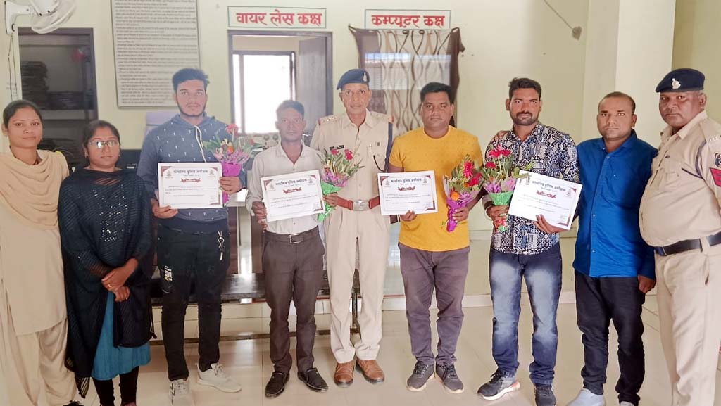 अनियंत्रित स्कूल बस के सोन नदी में गिरने पर बस में सवार बच्चों का सफलतापूर्वक रेस्क्यू करने वाले चार युवकों को किया सम्मानित