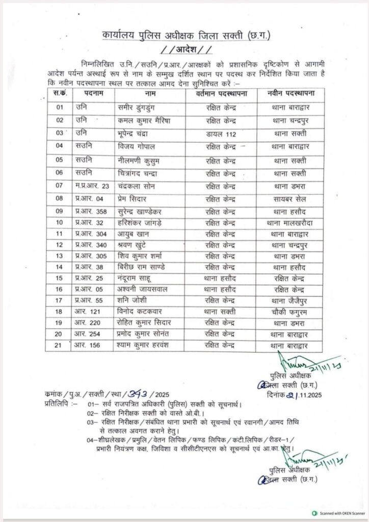 जारी आदेश में कुल 21 पुलिसकर्मियों को नई पदस्थापना दी गई है। कई को रक्षित केंद्र से अलग-अलग थानों में भेजा गया है, वहीं कुछ पुलिसकर्मियों को थानों से हटाकर रक्षित केंद्र में पदस्थ किया गया है।