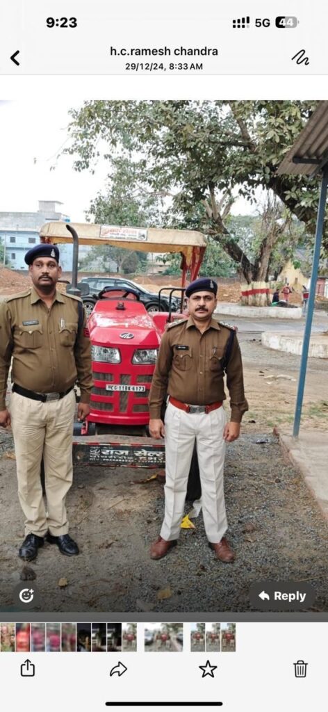सकती (डभरा )। 2 दिन के अंदर चोरी किए गए ट्रैक्टर को पुलिस ने बरामद कर कानूनी कार्रवाई की है मामले के संबंध में पुलिस ने बताया कि दिनांक 26/12/2024 को प्रार्थी जगन्नाथ साहू ग्राम रामभांठा थाना डभरा, थाना उपस्थित होकर सूचना रिपोर्ट दर्ज कराया कि इसके ट्रेक्टर महिन्द्रा क्र सीजी 11 बी के 6173 को ग्राम साराडीह से रात्रि में अज्ञात चोरो के द्वारा चोरी कर ले गया है की सूचना पर थाना डभरा में अप० क्र0 458/24 धारा 303 (2) बीएनएस के तहत अपराध पंजीबध्द कर विवेचना में लिया गया था। घटना की गंभीरता को देखते हुये पुलिस अधीक्षक, जिला – सक्ती सुश्री अंकिता शर्मा (भा.पु.से) के निर्देश्न तथा अति. पुलिस अधीक्षक सक्ती रमा पटेल, सुमित गुप्ता अनुविभागीय अधिकारी पुलिस चंद्रपुर डभरा के मार्गदर्शन पर थाना प्रभारी निरीक्षक प्रवीण राजपूत के नेतृत्व में तत्काल टीम गठित कर माल मुल्जिम पता साजी हेतु रवाना किया गया । उक्त चोरी गये ट्रेक्टर को अज्ञात चोरो द्वारा थाना सारंगढ क्षेत्र भादो के जंगल में छिपा कर रखा गया था जिसे टीम के द्वारा पता साजी कर दिनांक 28/12/24 को बरामद किया गया। कार्यवाही में निरी० प्रवीण राजपूत, उनि० सीएम मालाकार, प्रआर० राजेन्द्र वारेन, रमेश चन्द्रा, आर० राजेष्ट धिरहे, महेश मधुकर के महत्वपूर्ण भूमिका रही।