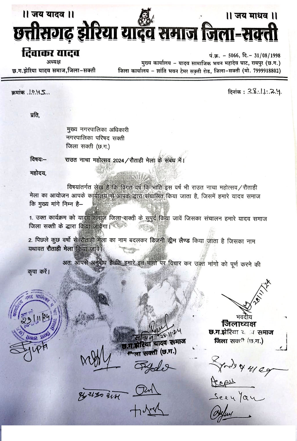 झेरिया यादव समाज के द्वारा मुख्य नगर पालिका अधिकारी को अपनी दो सूत्रीय मांगों को लेकर एक ज्ञापन भी सौंपा गया, जिसके माध्यम से मांग की गई है कि रावत महोत्सव के आयोजन एवं संचालन की संपूर्ण जिम्मेदारी यादव समाज को सौंप दी जाए और पिछले कुछ वर्षों से राउत नाचा महोत्सव/रौताही मेले का नाम बदलकर डिजनीलैंड मेला रखा गया है, जिसे यथावत रखते हुए पुन: इसका नाम राउत नाचा महोत्सव या रौताही मेला ही रखा जाए।