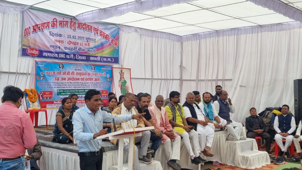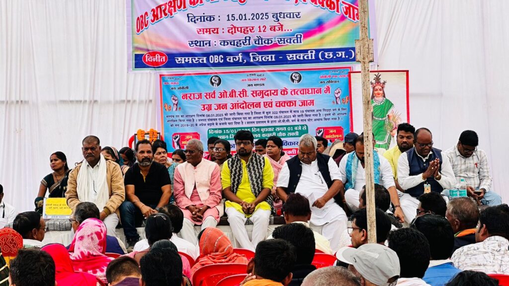 जिसके तहत 15 जनवरी 2025 बुधवार को सक्ती जिला मुख्यालय के कचहरी चौक में सर्व ओबीसी समाज सड़क की लड़ाई में विशाल जन आंदोलन और ओबीसी आरक्षण अन्याय के विरोध में आज