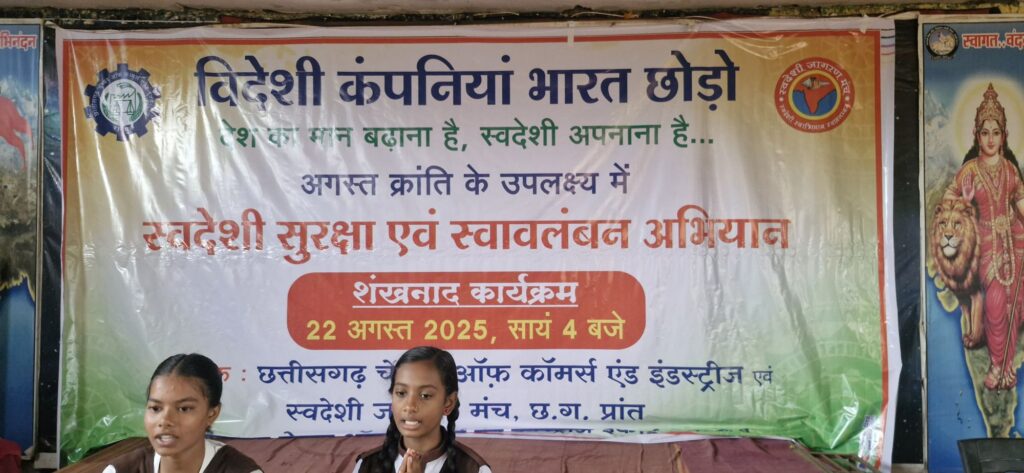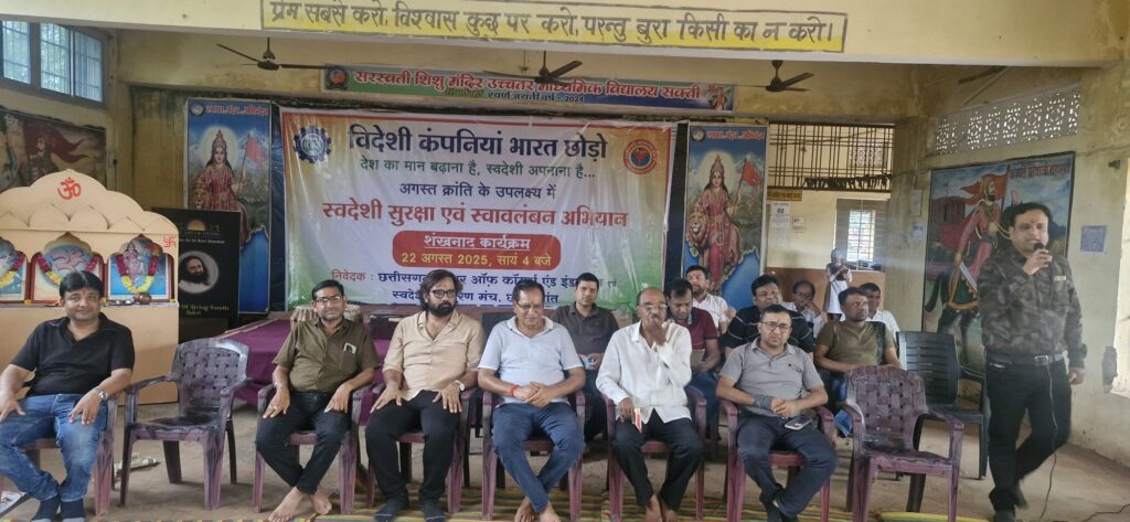 सक्ती। छत्तीसगढ़ चेंबर ऑफ कॉमर्स रायपुर के आह्वान पर चेंबर ऑफ कॉमर्स इकाई सक्ती द्वारा सरस्वती शिशु मंदिर स्कूल परिसर में “स्वदेशी सुरक्षा एवं स्वावलंबन अभियान” के तहत जागरूकता कार्यक्रम आयोजित किया गया। कार्यक्रम की शुरुआत स्कूली बच्चों को पंपलेट वितरण से हुई, जिसमें विदेशी कंपनियों के बहिष्कार और स्वदेशी वस्तुओं के उपयोग का संदेश दिया गया।