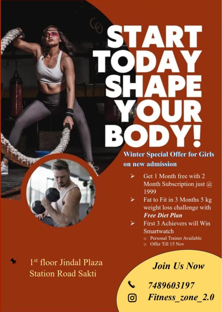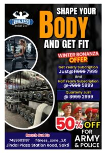 सक्ती नगर के सबसे बड़े जिम फिटनेस जोन–2.O में विंटर वेकेशन स्पेशल ऑफर — लड़कियों को 3 महीने का जिम 2000 रुपये में, पुलिस व आर्मी कर्मियों के लिए 50% डिस्काउंट